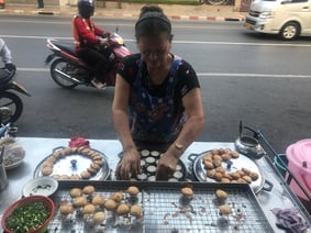 Wir haben auf den Van gewartet, welcher uns abholen sollte und damit wir nicht hungrig unterwegs sind, haben wir gleich noch ein paar von den Plätzchen aus Kokosmilch und Reis gegessen. Nun können wir euch auch endlich ein Bild davon zeigen. Darauf befinden sich gehackte Frühlingszwiebeln.