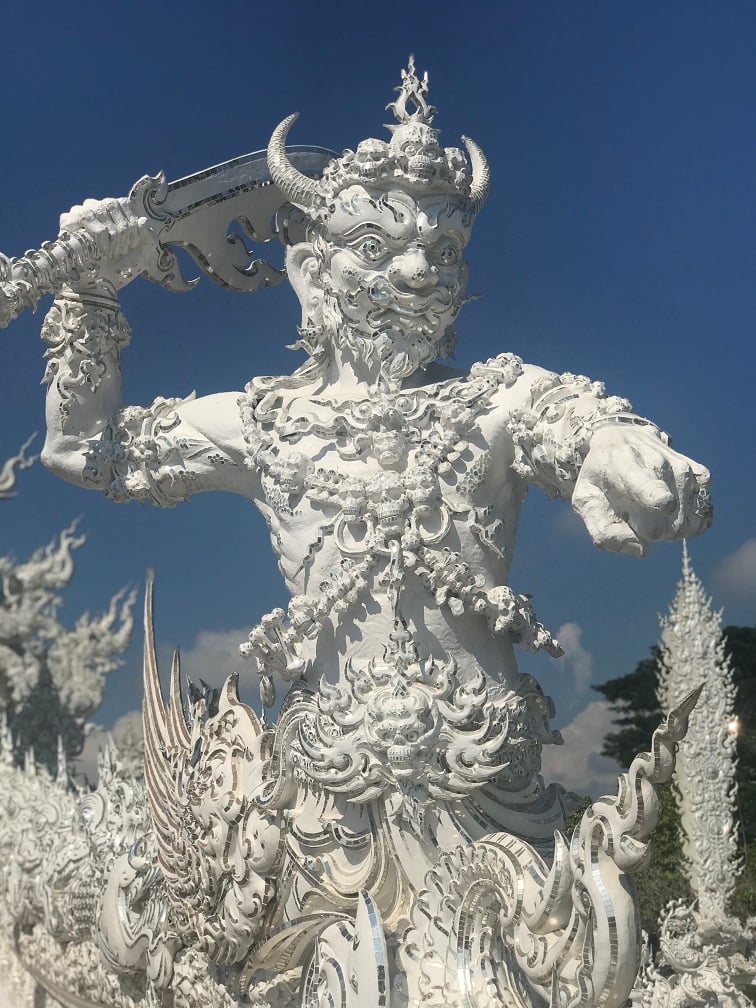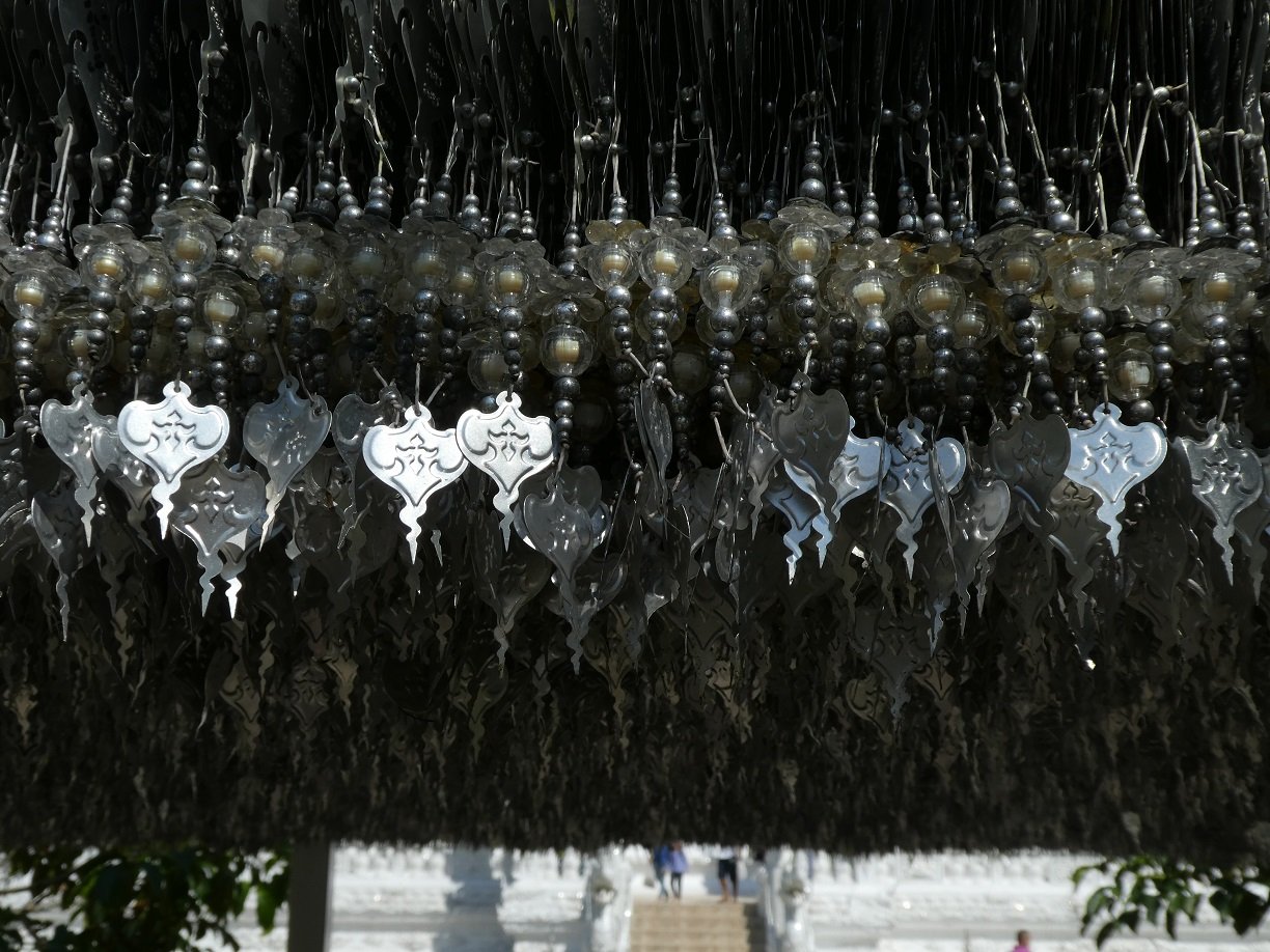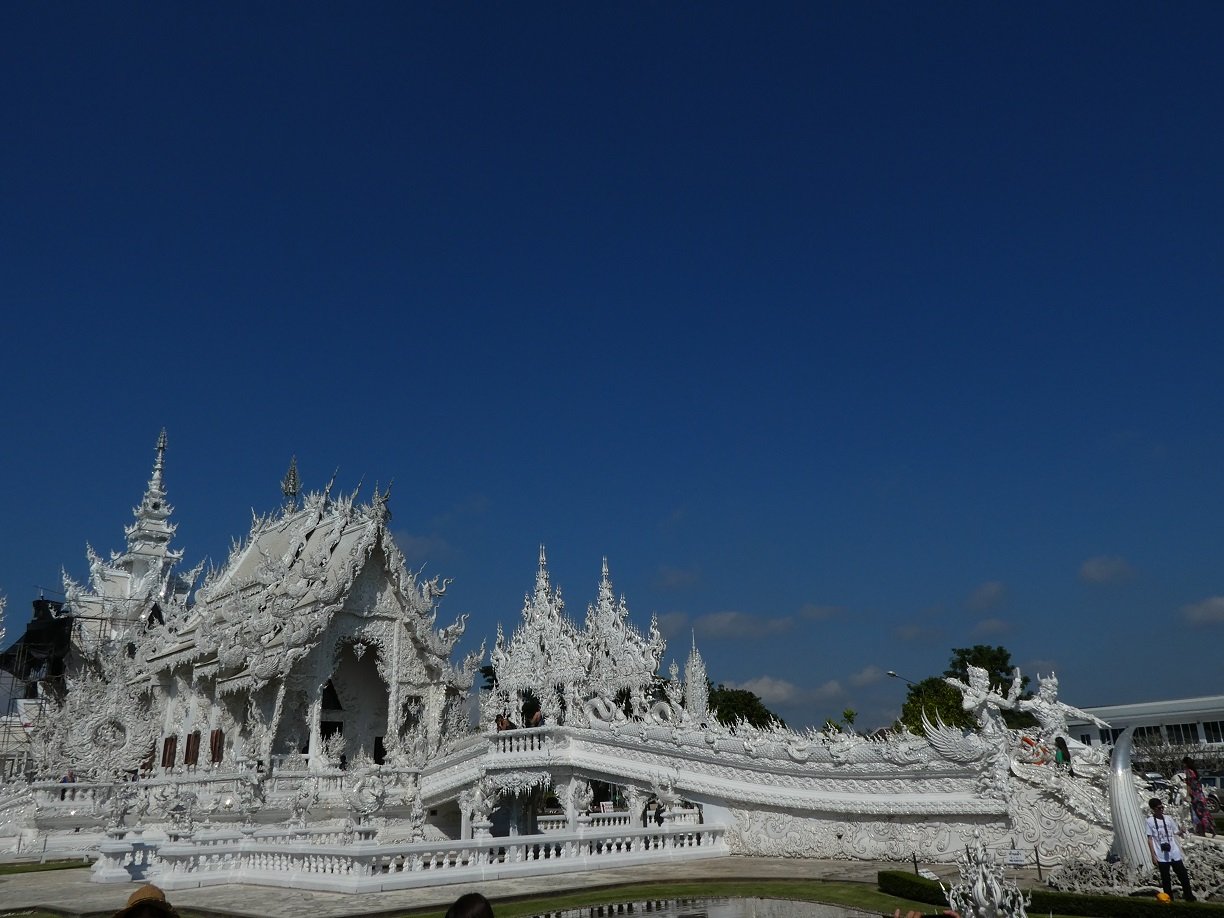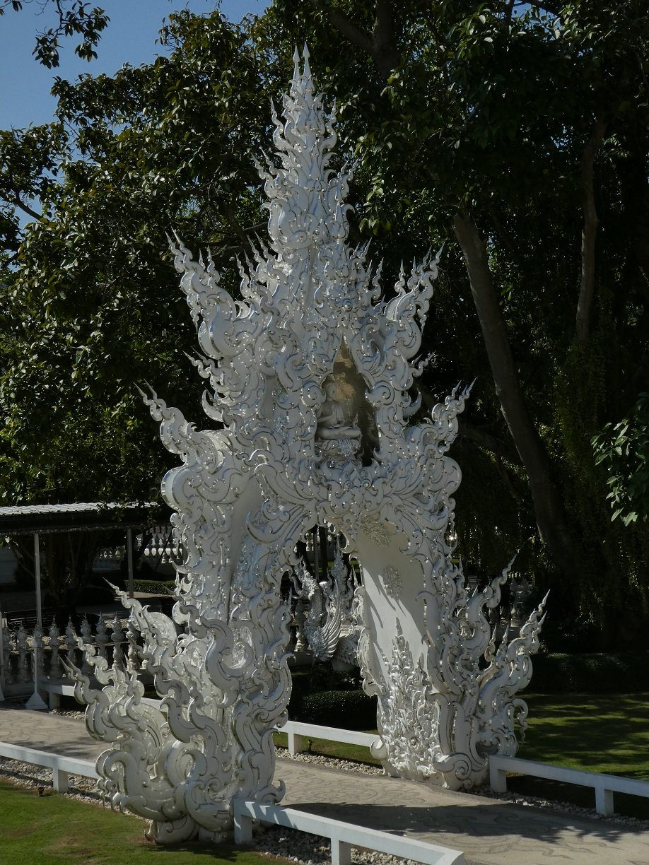 2. Halt: Der zweite Halt war beim Wat Rong Khun/"White Temple". Dieser ist seit dem Jahre 1997 im Bau und immer noch nicht fertig. Ich vermute, das liegt daran, dass der Bau des Tempels durch Spenden finanziert wird. Die Spenden dabei sind auf max. 10'000 Baht festgelegt, damit es unabhängig von Grossspendern ist. Er liegt zwischen den kleinen Orten Bua Sali und Pa O Don Chai und ist wirklich ein Besuch wert. Er ist gigantisch, wunderschön und vor allem sehr detailreich. Die Konzeption des Tempels geht auf den thailändischen Architekten Chalermchai Kositpipat zurück.