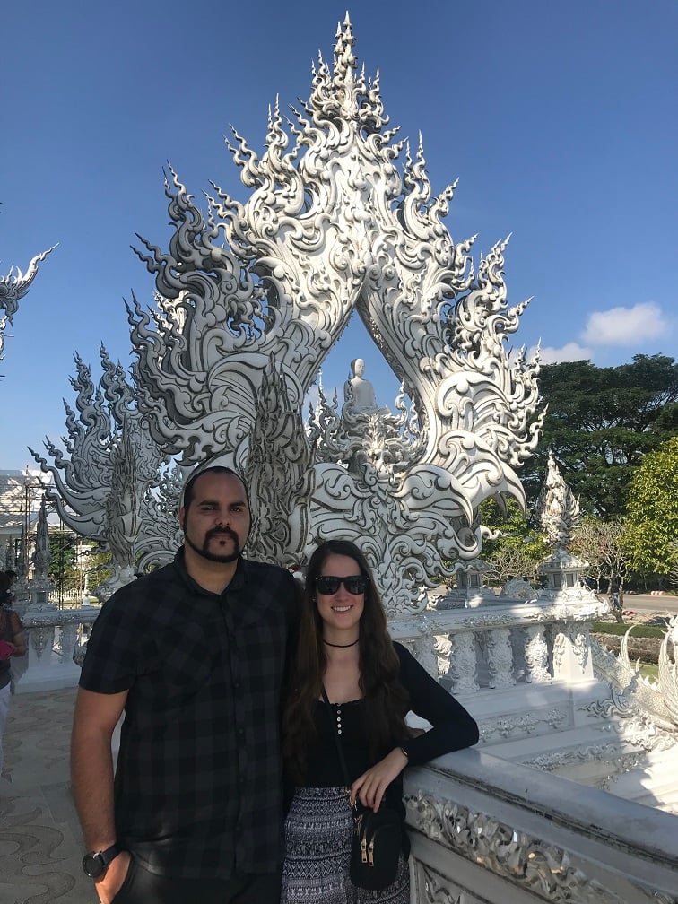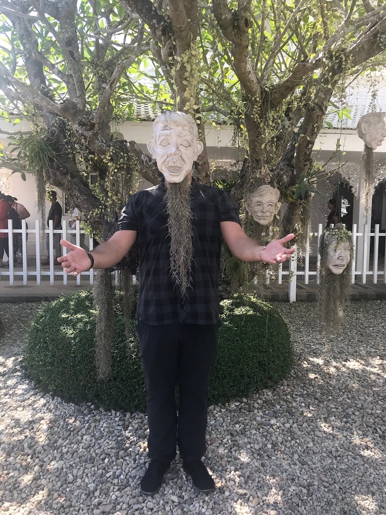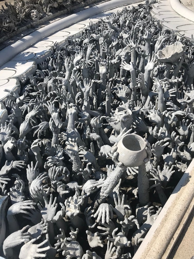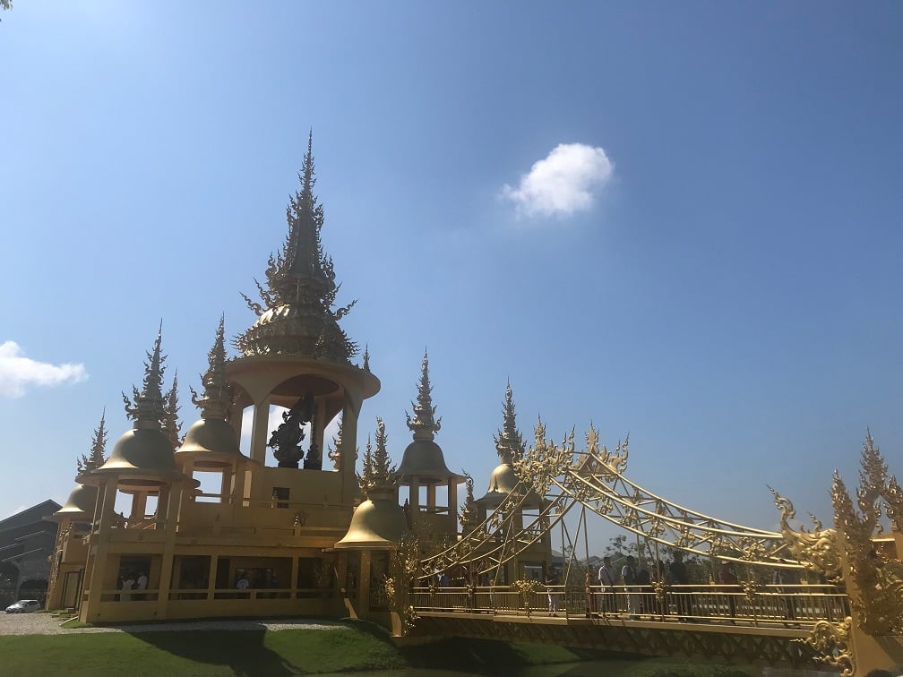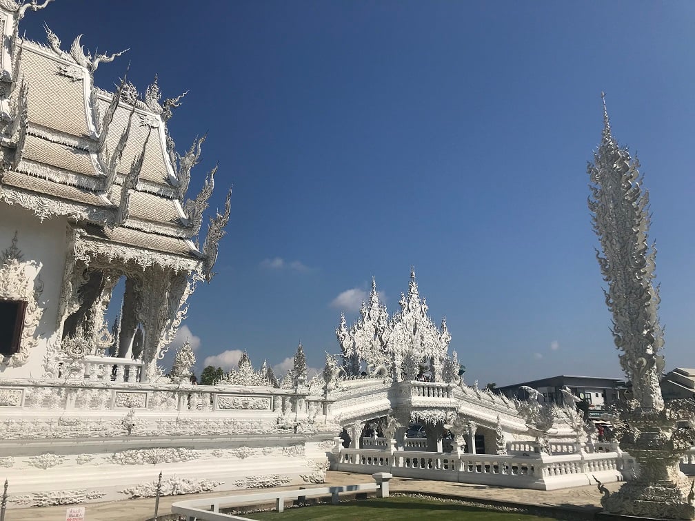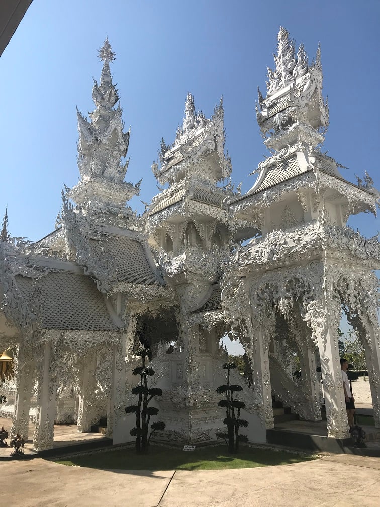 2. Halt: Der zweite Halt war beim Wat Rong Khun/"White Temple". Dieser ist seit dem Jahre 1997 im Bau und immer noch nicht fertig. Ich vermute, das liegt daran, dass der Bau des Tempels durch Spenden finanziert wird. Die Spenden dabei sind auf max. 10'000 Baht festgelegt, damit es unabhängig von Grossspendern ist. Er liegt zwischen den kleinen Orten Bua Sali und Pa O Don Chai und ist wirklich ein Besuch wert. Er ist gigantisch, wunderschön und vor allem sehr detailreich. Die Konzeption des Tempels geht auf den thailändischen Architekten Chalermchai Kositpipat zurück.
