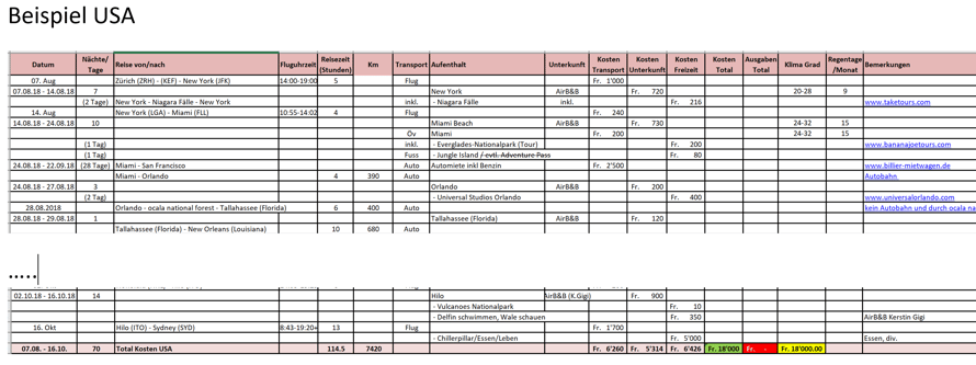 Wie ihr sehen könnt, haben wir günstige sowie teure Orte ausgesucht. Wir zeigen hier nur die grobe Routenplanung. Wie gross der Aufwand für die Planung wirklich war, seht ihr anhand der detaillierten Budgetplanung (lediglich kleiner Ausschnitt).